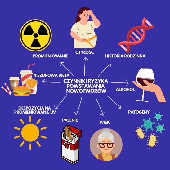 Ryzyko zachorowania na nowotwór zależy od połączenia czynników genetycznych, środowiskowych i związanych ze stylem życia. Do najważniejszych należą m.in. predyspozycje rodzinne, wiek, palenie papierosów, spożywanie alkoholu, otyłość, niewłaściwa dieta, ekspozycja na promieniowanie UV czy kontakt z substancjami rakotwórczymi. Również niektóre wirusy i przewlekłe infekcje mogą sprzyjać rozwojowi nowotworów . Posiadanie czynników ryzyka nie oznacza, że choroba na pewno wystąpi, ale zwiększa prawdopodobieństwo jej rozwoju – dlatego profilaktyka i wczesne wykrywanie są tak istotne.