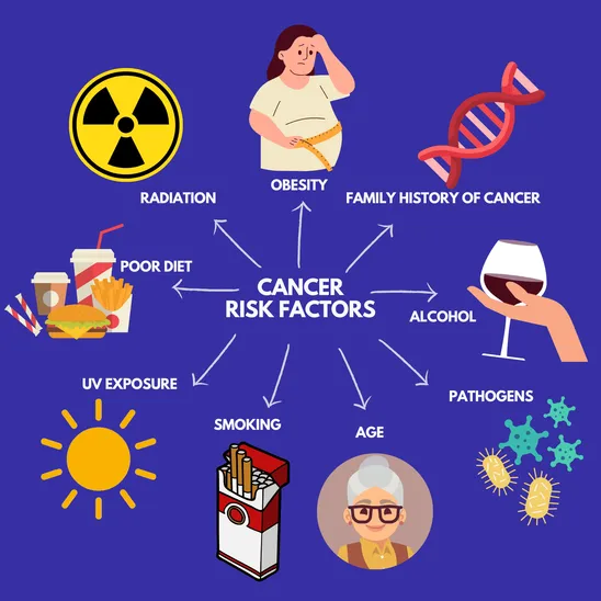The risk of developing cancer is influenced by a combination of genetic, environmental, and lifestyle factors. Key contributors include family history, age, smoking, alcohol consumption, obesity, poor diet, exposure to ultraviolet radiation and contact with carcinogenic substances. Certain viruses and chronic infections can also play a role in cancer development. Having risk factors does not mean cancer will inevitably occur, but it does increase the likelihood - highlighting the importance of prevention and early detection.