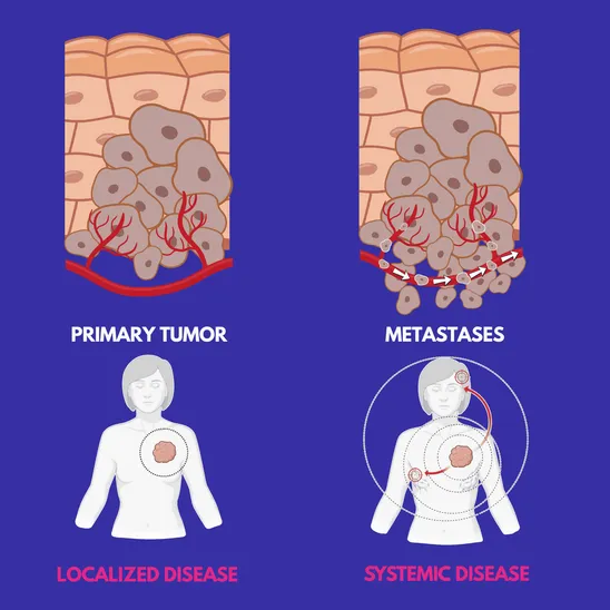 The most life-threatening feature of cancer is its ability to spread and form metastases. Cancer cells from the primary tumor can detach, invade surrounding tissue, and enter blood or lymphatic vessels. Through circulation, they travel to distant organs, where they may establish secondary tumors. While a primary tumor represents a localized disease, the presence of metastases indicates a systemic condition, which is far more difficult to treat and accounts for the majority of cancer-related deaths.