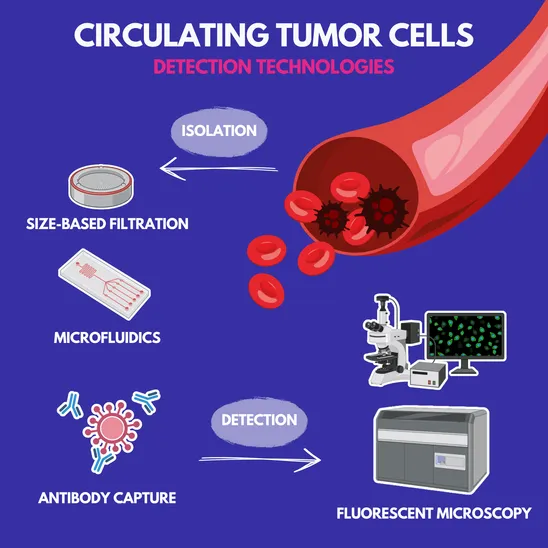 Circulating tumor cells (CTCs) are cancer cells that detach from primary or metastatic tumors and enter the bloodstream. They are extremely rare, sometimes only a few among billions of normal blood cells, which makes their detection highly challenging. Advanced ultrasensitive technologies are used to capture and study them, including imaging flow cytometry, microfluidic chips, size-based filtration, and antibody-based enrichment methods. The ability to analyze CTCs provides a minimally invasive way to gain real-time insights into tumor biology and metastasis.